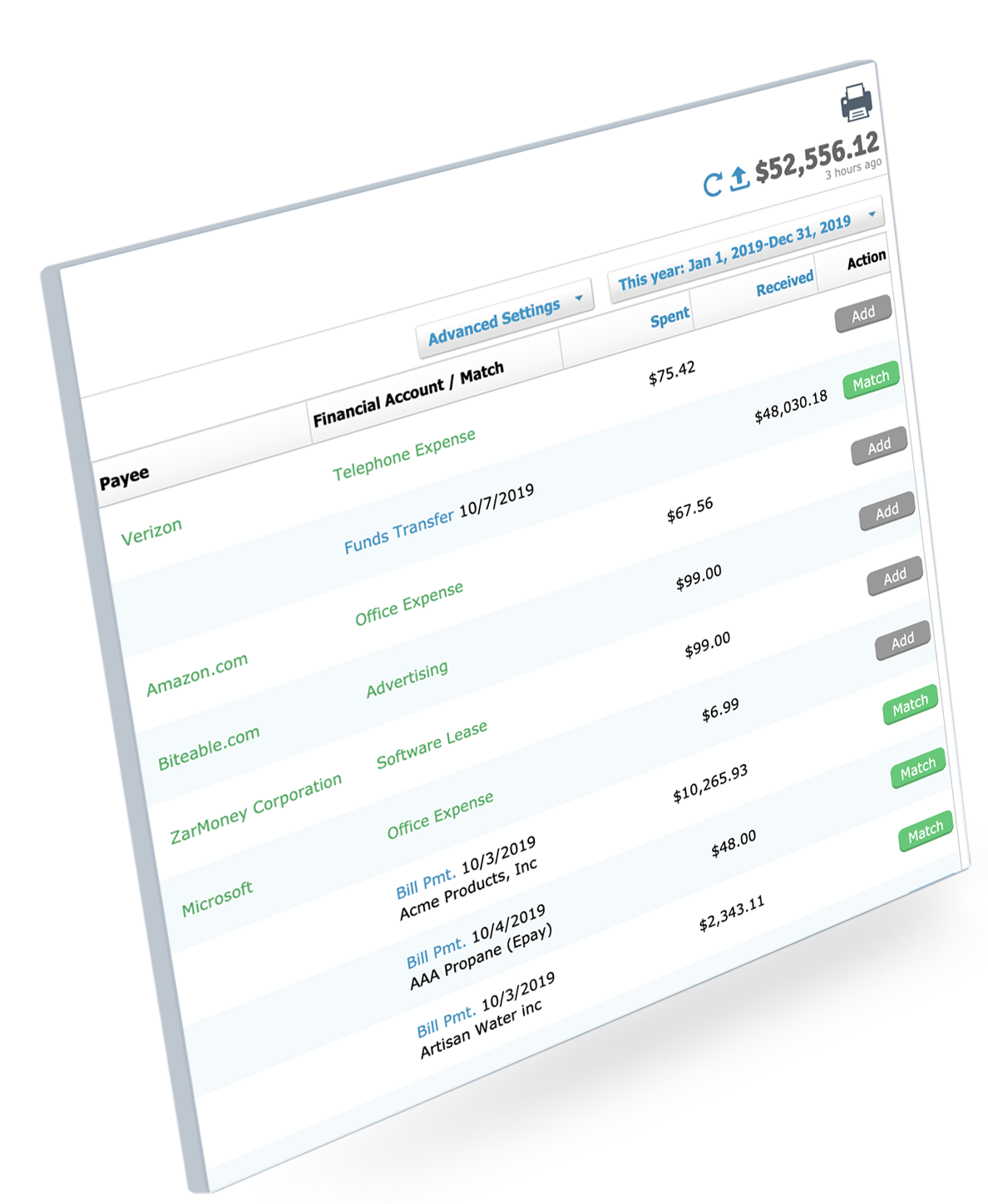 Manage your cash flow with ease via ZarMoney’s payables calendar. Upload invoices, add receipts, print checks in bulk, pay multiple vendors at once, and simplify recurring payments. ZarMoney makes it easy to track payables - enabling you to create payments from the available balance without any hassle.